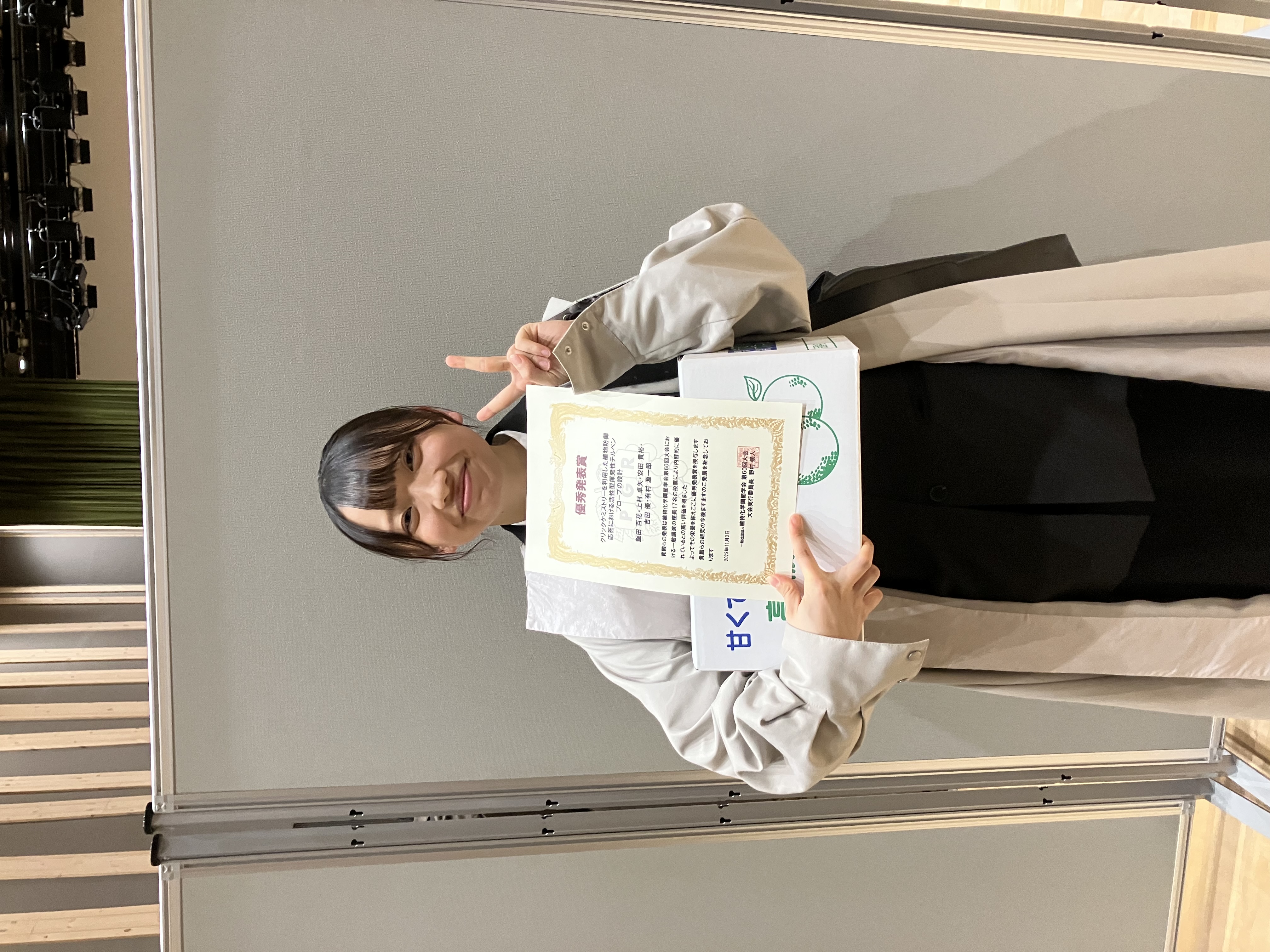東京理科大学生物環境イノベーション研究部門・公開シンポジウムにて、田中未来(M1)、小倉菜桜(B4)、林海斗(B4)が口頭発表しました。田中未来はプレゼンテーション賞を受賞しました。