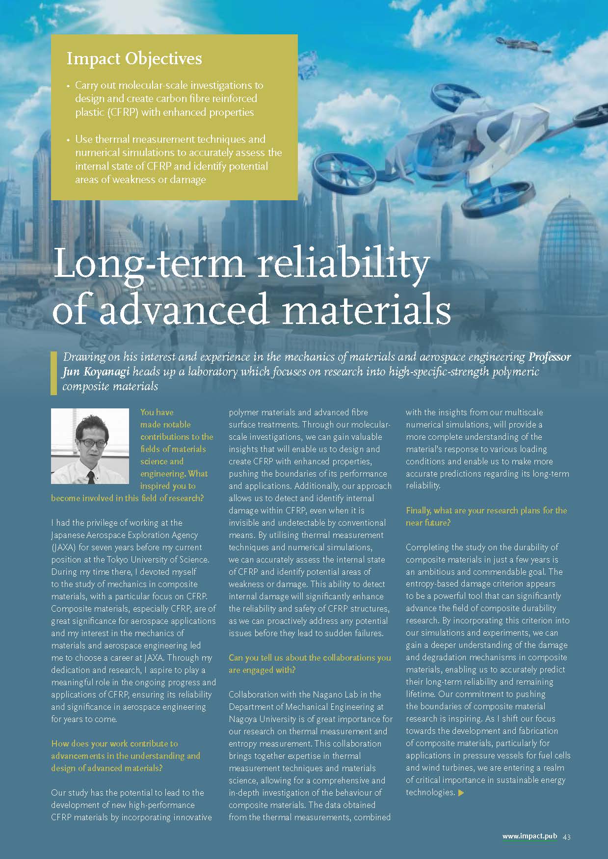 As the human culture has developed, it has undergone advancements from the Stone Age, through the Iron Age, to the 21st century, in which composite materials are in use. Koyanagi Laboratory mainly deals with high-specific-strength polymeric composite materials for the aerospace field and conducts mechanics-based studies and development of novel functional materials. Thermal and mechanical properties of composite materials and structures are evaluated experimentally and analytically for aircraft and spacecraft designs. We aim to improve material properties through the production of new composites.