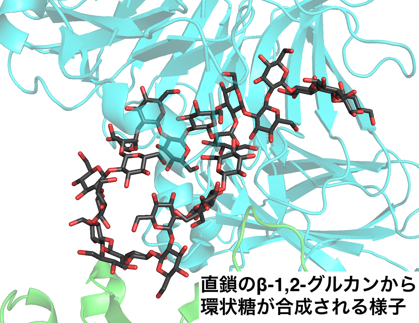 β-1,2-グルカンというおそらく聞いたことがない珍しい糖鎖を材料としています。しかし、これもグルコースからできている糖鎖であり、その点はデンプンや植物細胞壁の主要成分であるセルロースと同じです。生物における最も主要な糖が鎖状になったものでさえよく知らないものがある、これは糖鎖の奥深さを表していると考えています。